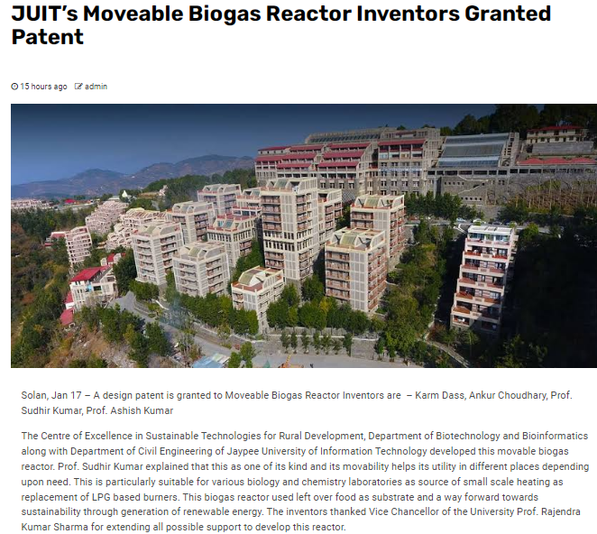 The Centre of Excellence in Sustainable Technologies for Rural Development, Department of Biotechnology and Bioinformatics along with Department of Civil Engineering of Jaypee University of Information Technology developed this movable biogas reactor. Prof. Sudhir Kumar explained that this as one of its kind and its movability helps its utility in different places depending upon need. This is particularly suitable for various biology and chemistry laboratories as source of small scale heating as replacement of LPG based burners. This biogas reactor used left over food as substrate and a way forward towards sustainability through generation of renewable energy. The inventors thanked Vice Chancellor of the University Prof. Rajendra Kumar Sharma for extending all possible support to develop this reactor.