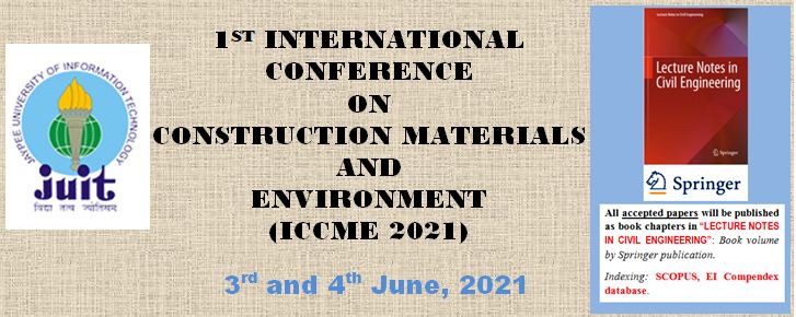 The rapid advance of technology brings tremendous change and its impacts are upon every nation in the world. The fourth industrial industry will profoundly alter how things work and Civil Engineering too will advance from the current state. Stakeholders of Civil Engineering such as academicians, researchers, engineers, and policy makers must be ready to adapt and to progress in different mindsets of societies, different engineering method, different demand of infrastructures and different policies. Therefore, Civil Engineering department of JUIT, Waknaghat will hold The First International Conference of Construction Materials and Environment (ICCME) to provide the international platform for professionals of their expertise to share the information about the state of art of Civil Engineering. By having better understanding of the current state and by establishing firm collaboration with each other, Civil Engineering stakeholders will be more prepared to thrive in perpetually progressing civilization. The theme of The First International Conference of Construction, Infrastructure, and Materials is Towards the Future of Civil Engineering Roles to Progressive Infrastructures Worldwide. The prospective participants are welcomed to submit papers with the following subjects:- Structural Engineering