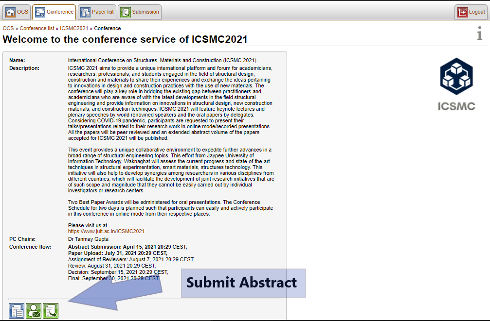 - Abstracts should be submitted on International Conference on Structures, Materials and Construction (ICSMC 2021).