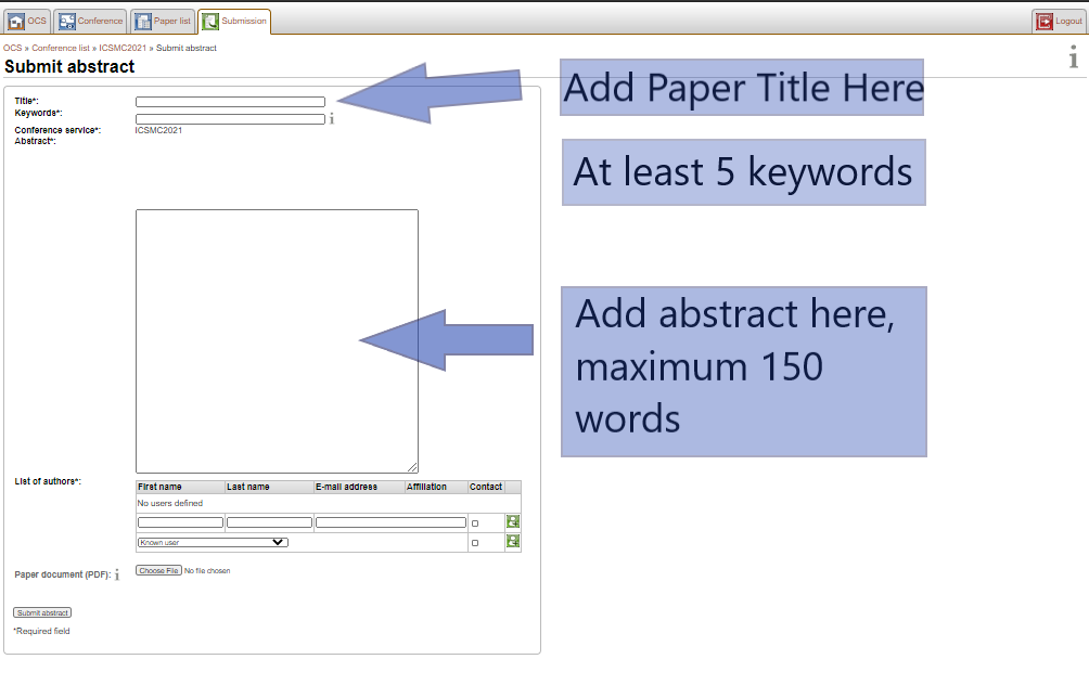 - The paper should begin with title, short abstract and a list of keywords. Simultaneous submissions (papers already submitted to other conferences/journals) are not allowed.