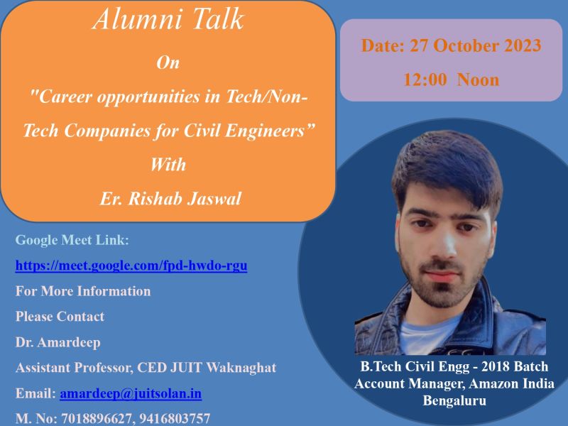 Alumni Talk by Rishab Jaiswal Career opportunities in TechNon-Tech Companies for Civil Engineers: 27 October, 2023