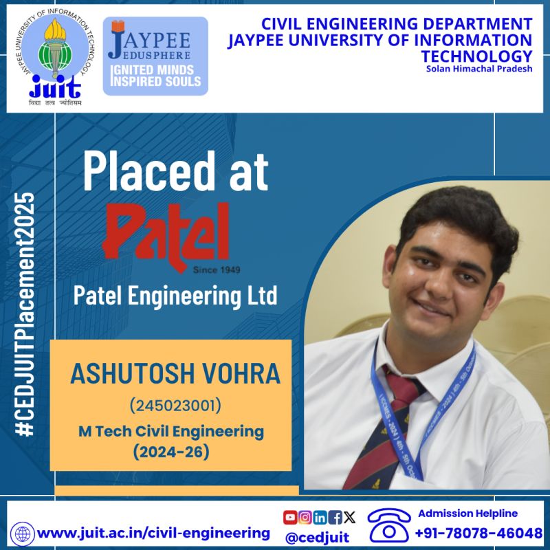 Ashutosh Vohra M.Tech Place in Patel Engineering Ltd.