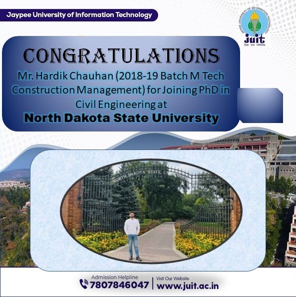 Hardik Chauhan (2018-19 Batch M Tech Construction Management) for Joining PhD in Civil Engineering at North Dakota State University