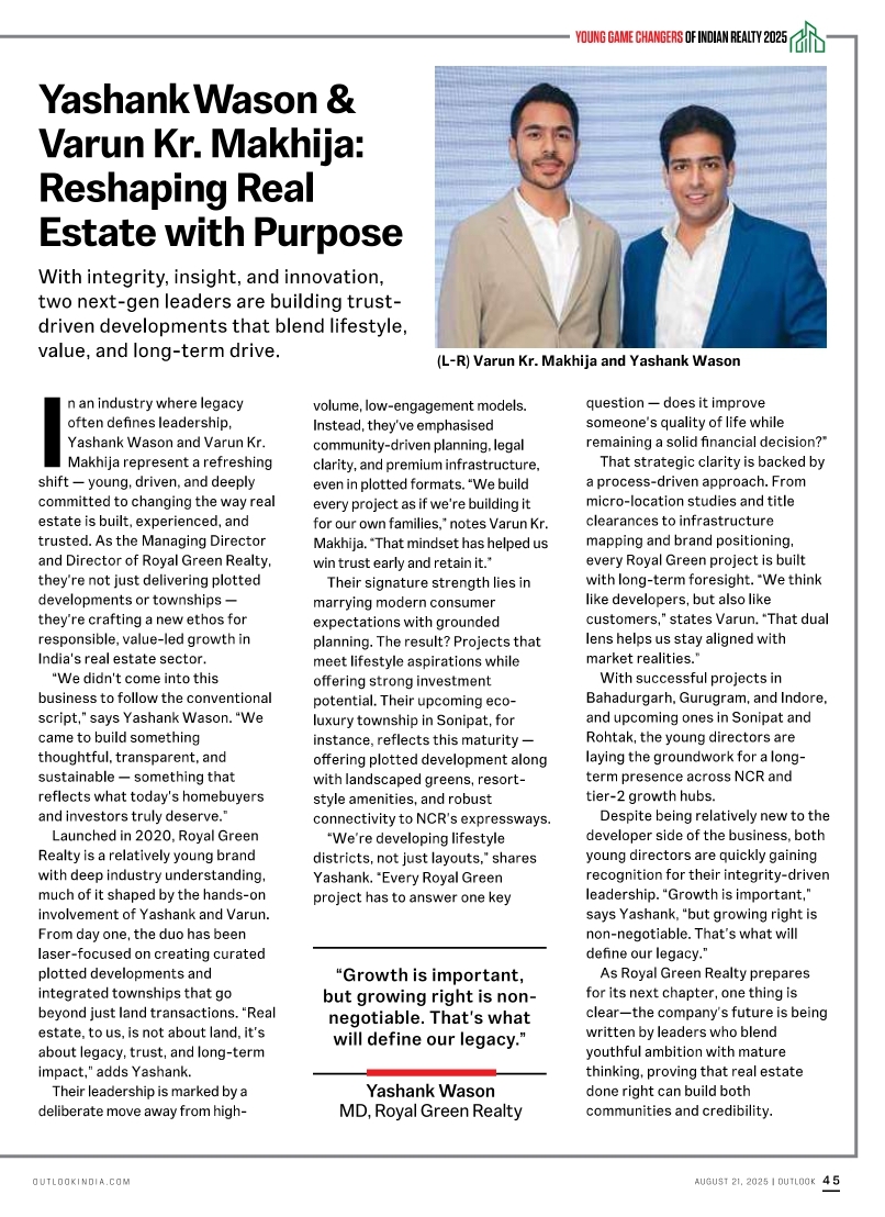 Yashank Wason (Btech Civil 2009-2013) featured in outlook- Young Game Changers of Indian Reality 2025
