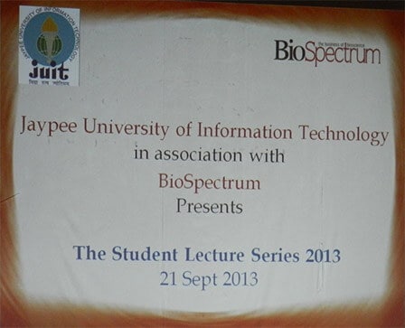 It was great display of energy and enthusiasm by more than thousand students who gathered for the BioSpectrum Student Lecture Series (SLS) organized at Jaypee University of Information Technology (JUIT), Solan campus. Coming from various corners of Himachal Pradesh, these aspiring students listened patiently to industry experts during their respective talks on exploring entrepreneurship and corporate opportunities in the biotechnology sector. Held on September 21, 2013, this chapter of SLS was a part of the initiative to create connect between industry and students, replicated earlier at Bangalore, Mumbai and other major cities of India.